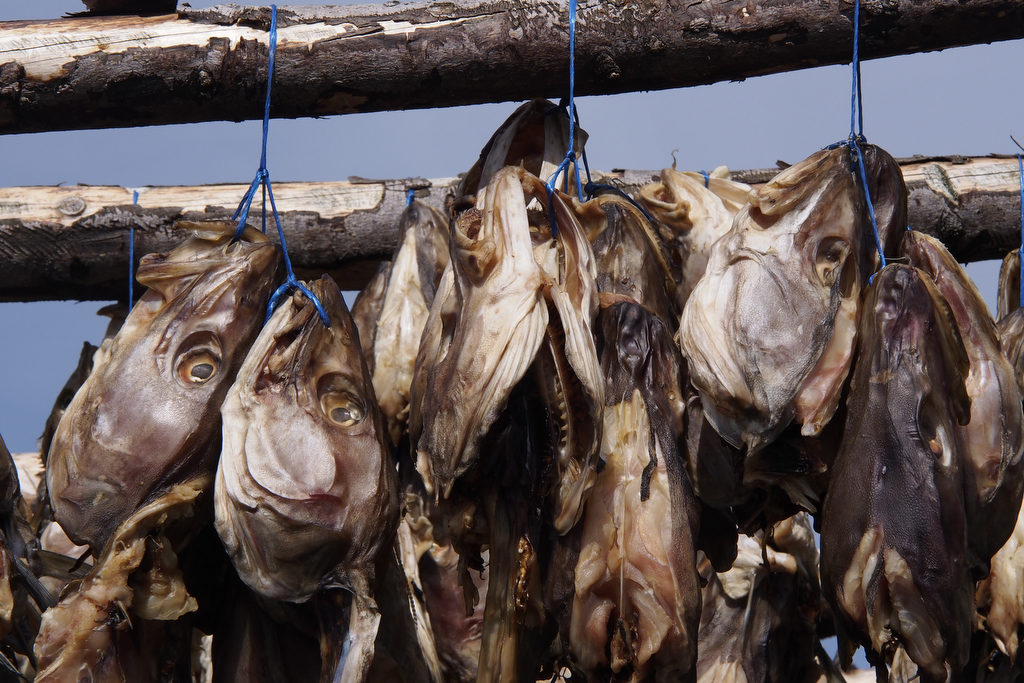 It was brutal. We repeatedly got blown off our bikes and ended up walking for short stretches. As we slowly progressed down hwy. 42 toward Krusavik an odour became stronger and stronger. A fishy odour. When we crested a little hill we figured out why: rows and rows of racks with fish in various stages of desiccation. Well, not all of them really held fish but rather fish bits. Heads and tails. The smell was overwhelming. Guess the wind blows a lot there or else they wouldn’t be hanging fish to dry.