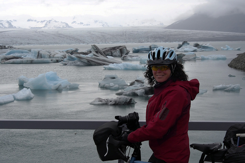 The next morning dawned cloudy with some wind which quickly strengthened and turned into another headwind. We beat into it for 3 hours until we got to Jokulsárlón, a lagoon full of icebergs off Vatnjökull. A bit of a tourist draw, complete with amphibious vehicles taking busloads of people for a quick spin around part of the lagoon between some bergy bits. Luckily, there is a small cafe where we had a break and a snack before going another 13 km to Gerdi where we camped at a guesthouse. All in all, not a bad day as we managed 73 km but we were dead tired. A hot shower and a dinner of whatever we had left to eat (quinoa, can of corn, can of peas, can of tuna, alfredo sauce, all mixed together. Yummmm!) and we were ready for bed.