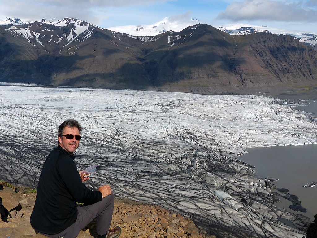 Our afternoon and evening in Skaftafell were pure pleasure. We hiked up a hill overlooking glaciers spilling off Vatnajökull. Impressive scenery, to say the least. Glorious sunshine and very little wind. We bought some cheap (light) beers and a bag of chips at the campground store and enjoyed our bliss. For the first time in Iceland, we enjoyed a night’s sleep without the relentless flapping of the tent.