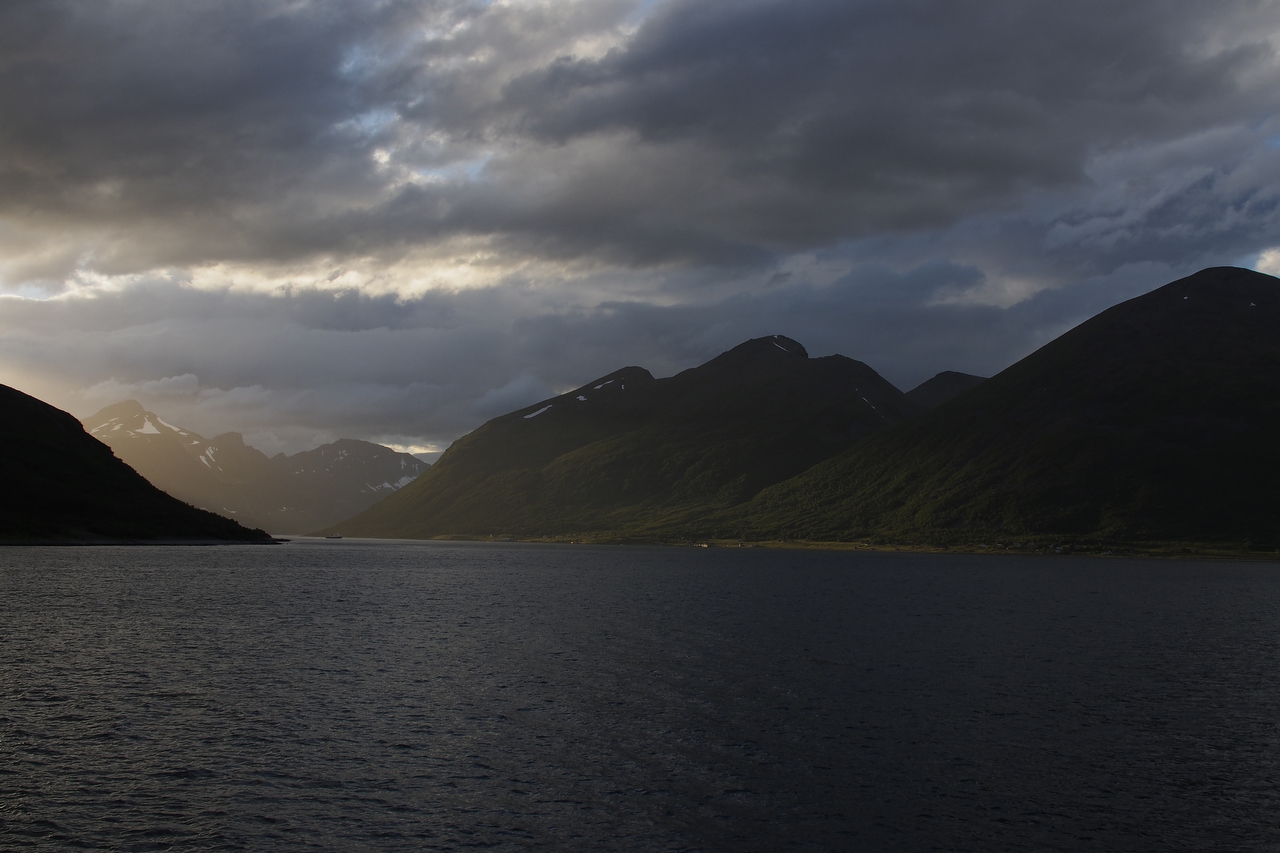 Sun illuminates a fiord near midnight along the northern Norwegian coast.