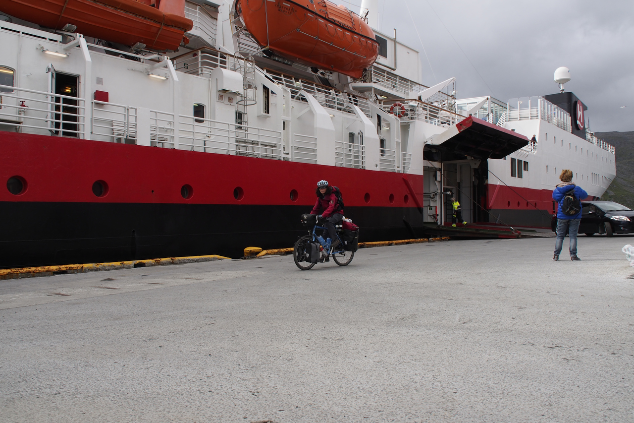 Jan cycling off the Hurtigruten in Honningsvåg.