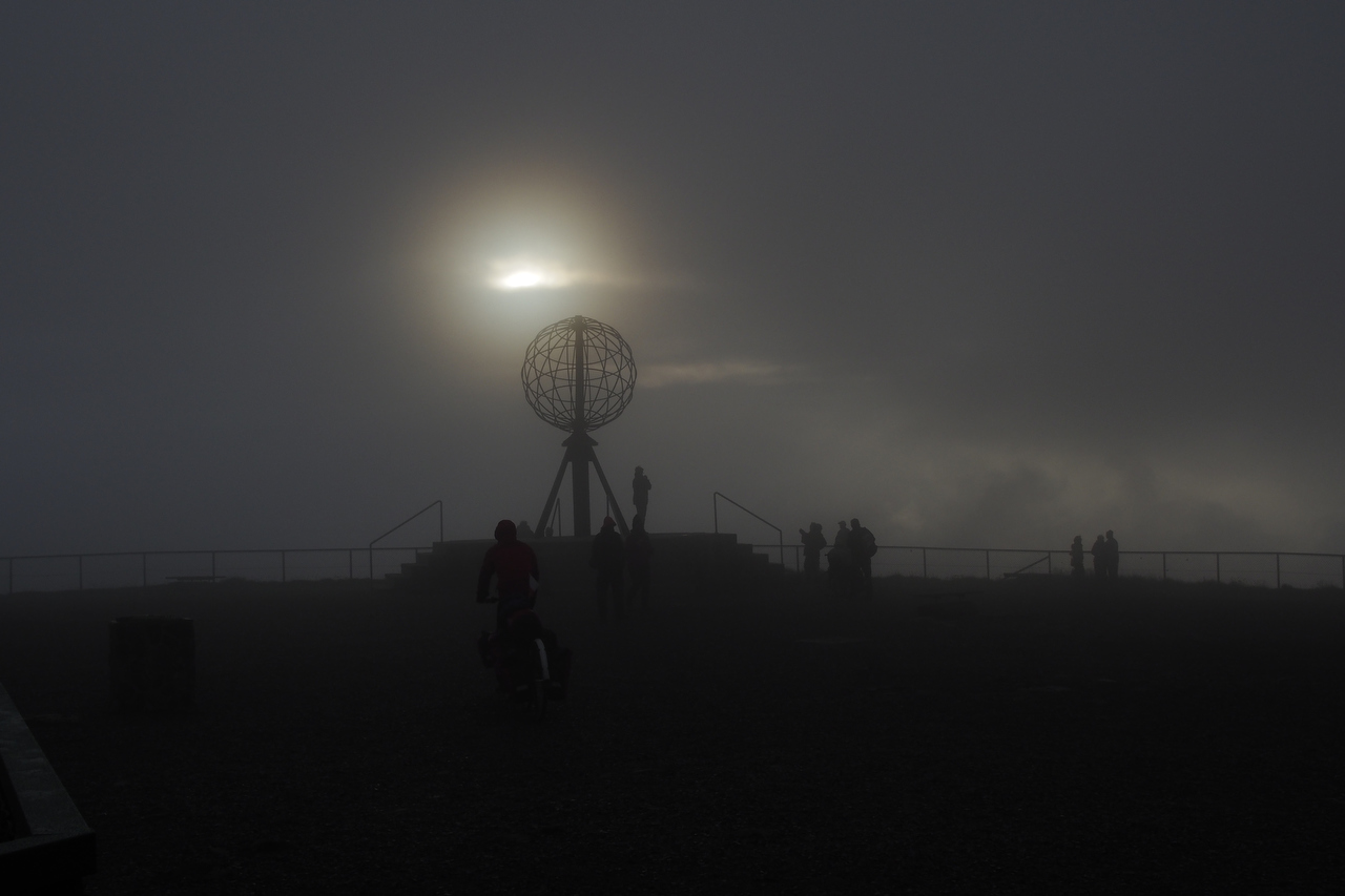 Here we are, midnight at Nordkapp. Yes, those are down jackets! No sun.