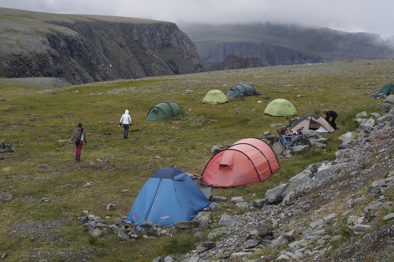 The wind remained “fresh” all day and, unfortunately for us, blew in the wrong direction. Occasionally, the road swung to give us a bit of a tail wind, but we mostly took it in the face. It turned into a very long and hard 86-kilometre day by the time we arrived in Repvåg at 8 PM, exhausted, cold and sore from battling the wind. We pitched our tent in the least windy spot we could find between the café and a Finnish motorhome and bolted for the showers. Standing under the hot spray slowly made everything okay again. I lingered in its warmth until the 10 Kronur ran out and I got blasted back to reality with a shot of cold water.