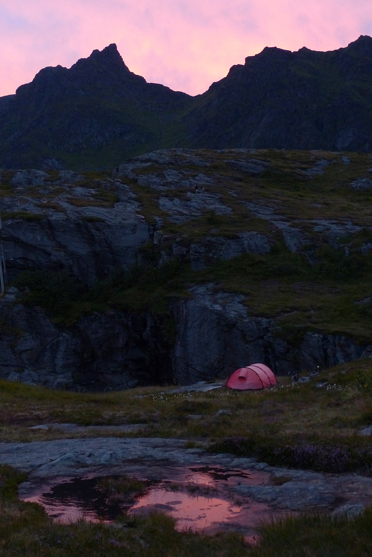 From Sortland, we rode south along the east coast of Langøya Island and made our way to Melbu on Hadseløya Island. We found a nice beach to camp just outside of Melbu, where the ferry to the Lofoten docks. We watched the sun slowly move across the horizon until it dipped behind a mountain. Yet another endless evening.