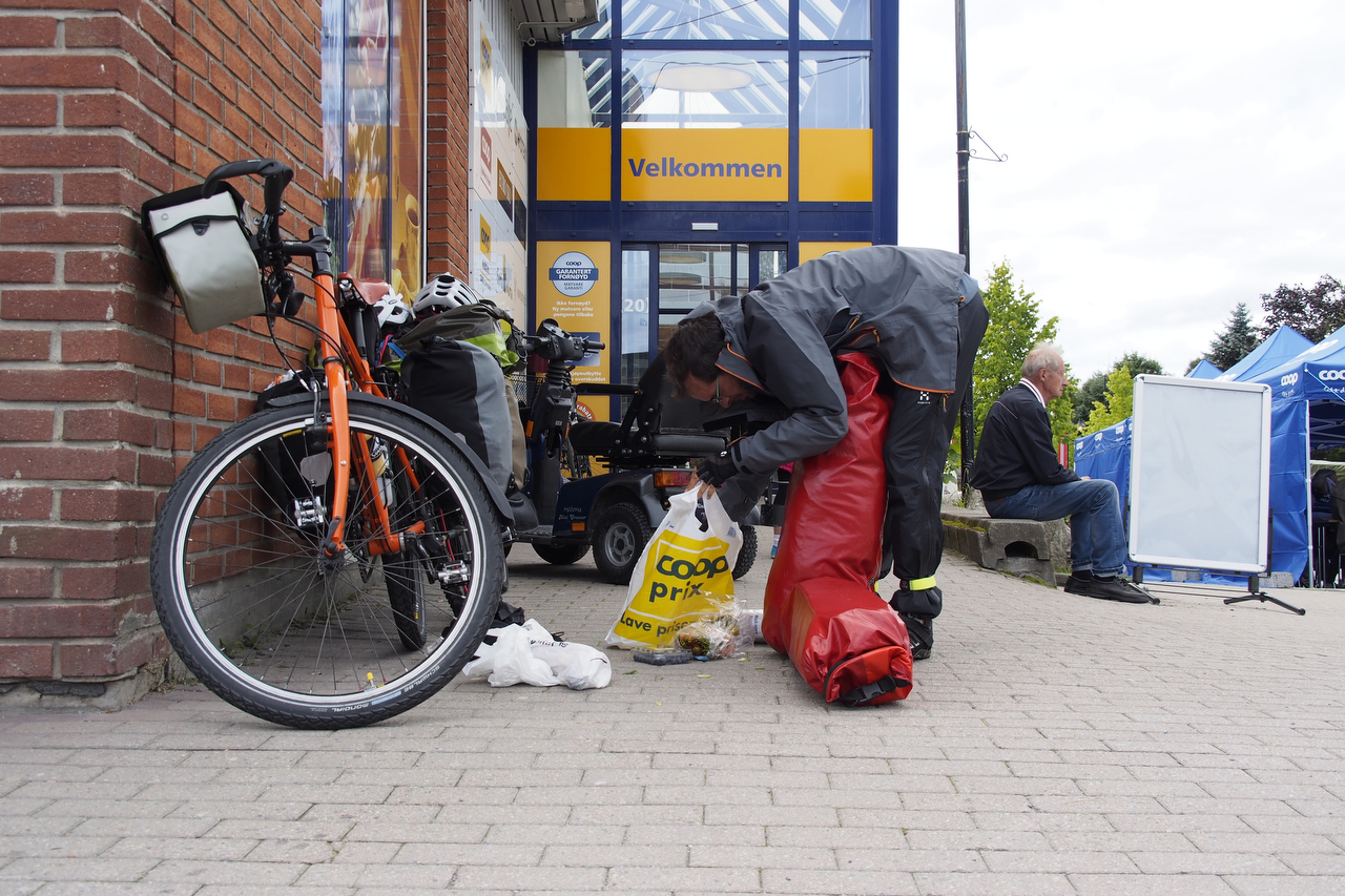 Did we ever pick the wrong week to arrive in Trondheim. There is a fishing convention in town and just about every hotel room is booked. We were looking forward to a night in the city but it was not to be. We did find some availability at a Comfort Inn for $450, for a quad, or $350 for a double. Triple the rack rate! Instead, after securing train tickets, we cycled, in the pissing rain, 11 KM west to the nearest campsite.