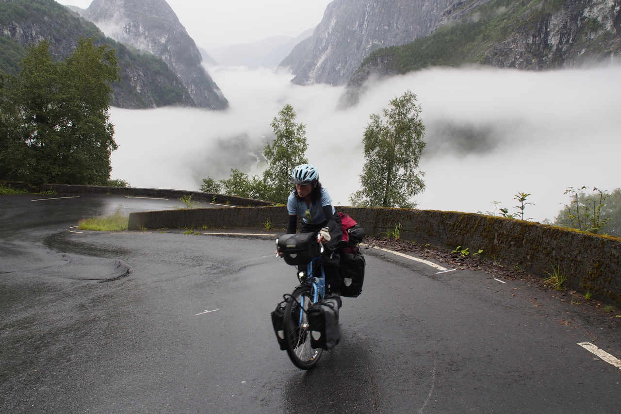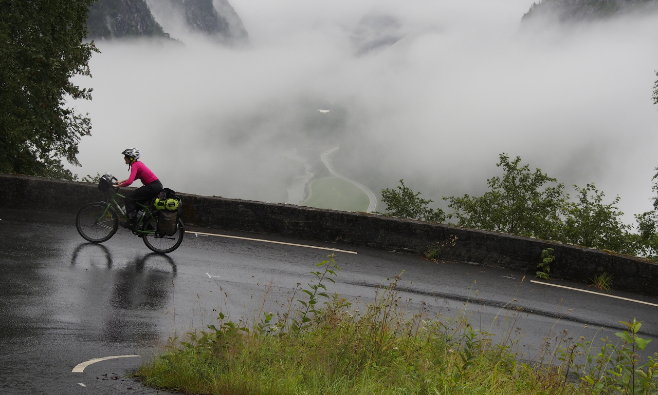 At Gudvangen, we rented a small cabin and slept inside for a change, knowing the weather was going to go sideways on us overnight. We awoke to a steady drizzle and delayed getting on the road, not so much because of the rain, but mostly because of the road ahead. There is another long tunnel closed to cyclists so we had to take the old road: Stalheim, one of Norway’s steepest climbs at 18 per cent.