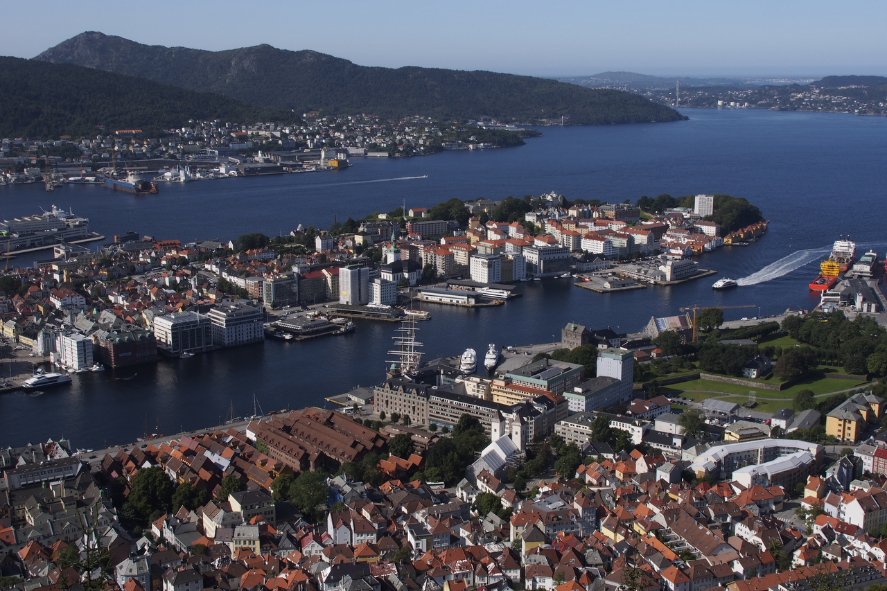 Bergen has a reputation for rain. We live in rainy Vancouver, so how much could it rain here, really. Well, the statistics tell us that Vancouver gets an average of about 1150 mm of rain (over 161 days) per year. Bergen gets 2500 mm ( over 275 days) per year. This is a wet place. More like North Vancouver, which gets a similar amount of rainfall at the base of the mountains. However, we were lucky to be in Bergen on some of the few sunny, warm days they get every year. It was brilliant sunshine and we loved it. The city is beautifully situated on the water with mountains all around.