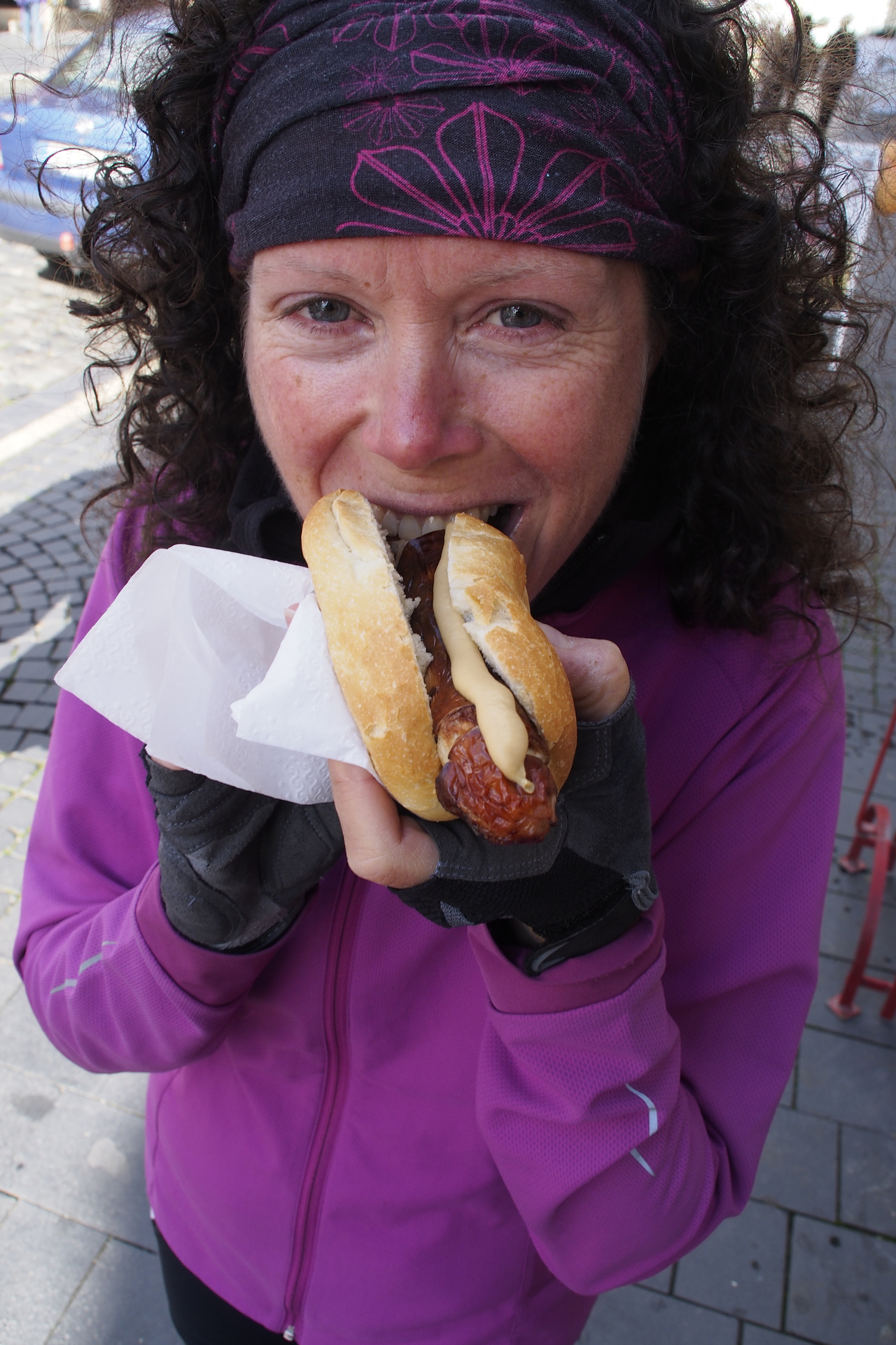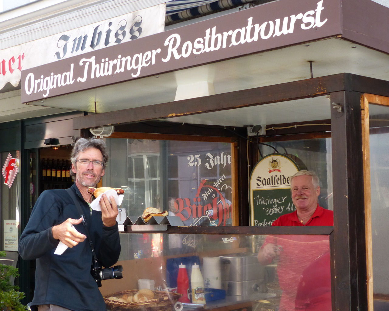 One of the highlights: Thüringer Rostbratwurst, a fine sausage served on a bun with mustard. It’s a delicious spiced sausage often made with finely minced pork or beef and sometimes veal, and sold at stands in towns everywhere. They’ve been making these for hundreds of years and have perfected the art. They are leaner than most other sausages with a mere 25 % fat content. It makes a great mid-morning snack for a hungry cyclist. Lots of calories but good ones. Kind of like a second breakfast. Yummy.