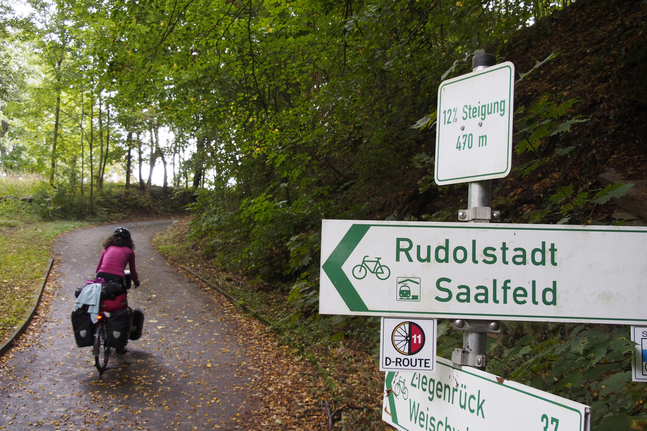 We have been camping except when we arrived in Ziegenruck and the campsite was closed for the season. We checked out several of the hotels and pensions and finally settled on Pension Wagner. When we asked to see the room, the proprietress gave us a rough “NO! Trust me, it’s all in order.” But we kept asking questions in broken German and she finally showed us the room. Spotless, although it looked like somebody’s basement from the 70s. Then when we asked her about bicycle storage she asked about our trip and was impressed by what we told her and her demeanour changed from brusque to quite friendly. We took the room for 56 euros, including breakfast, and went out for dinner (45 euros) in a local restaurant. An expensive day but the weather had kind of crapped out so it was nice to sleep inside.