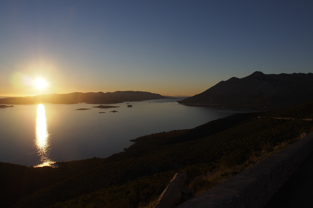 Reaching the top, we were rewarded with a gorgeous view. The island of Korčula and its surrounding smaller islands were silhouetted against a brilliant orange sun as it dropped below the horizon.