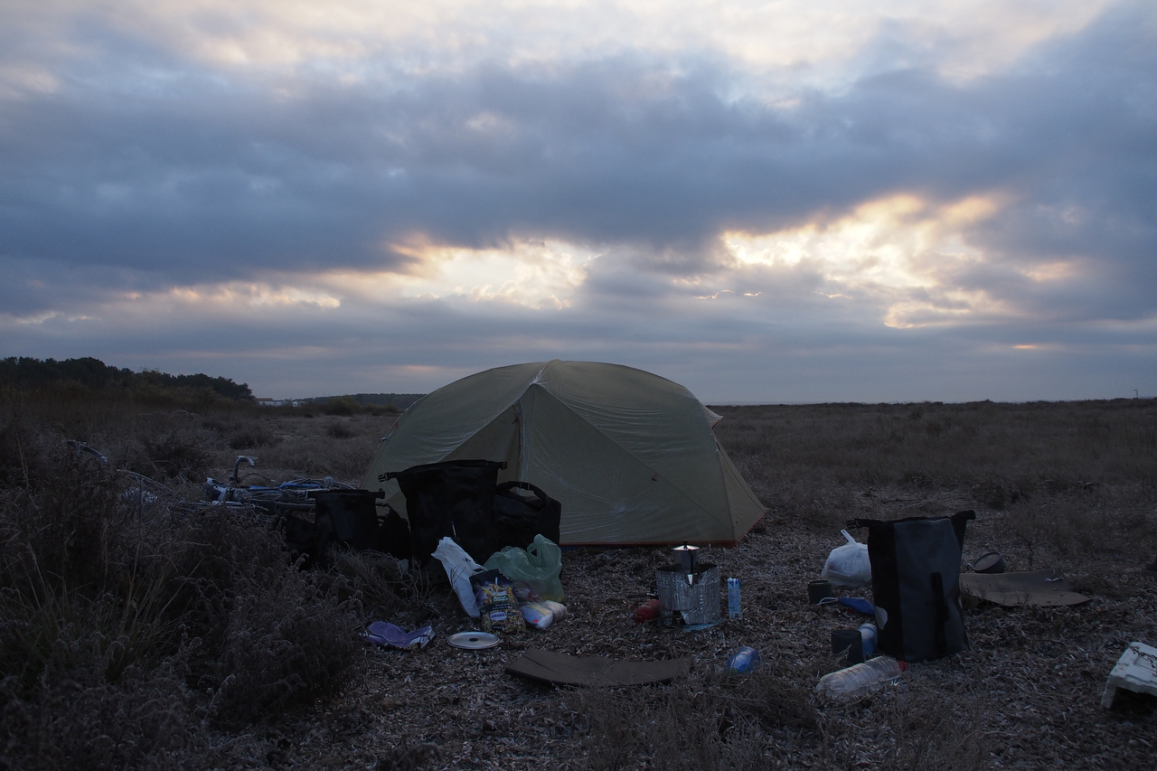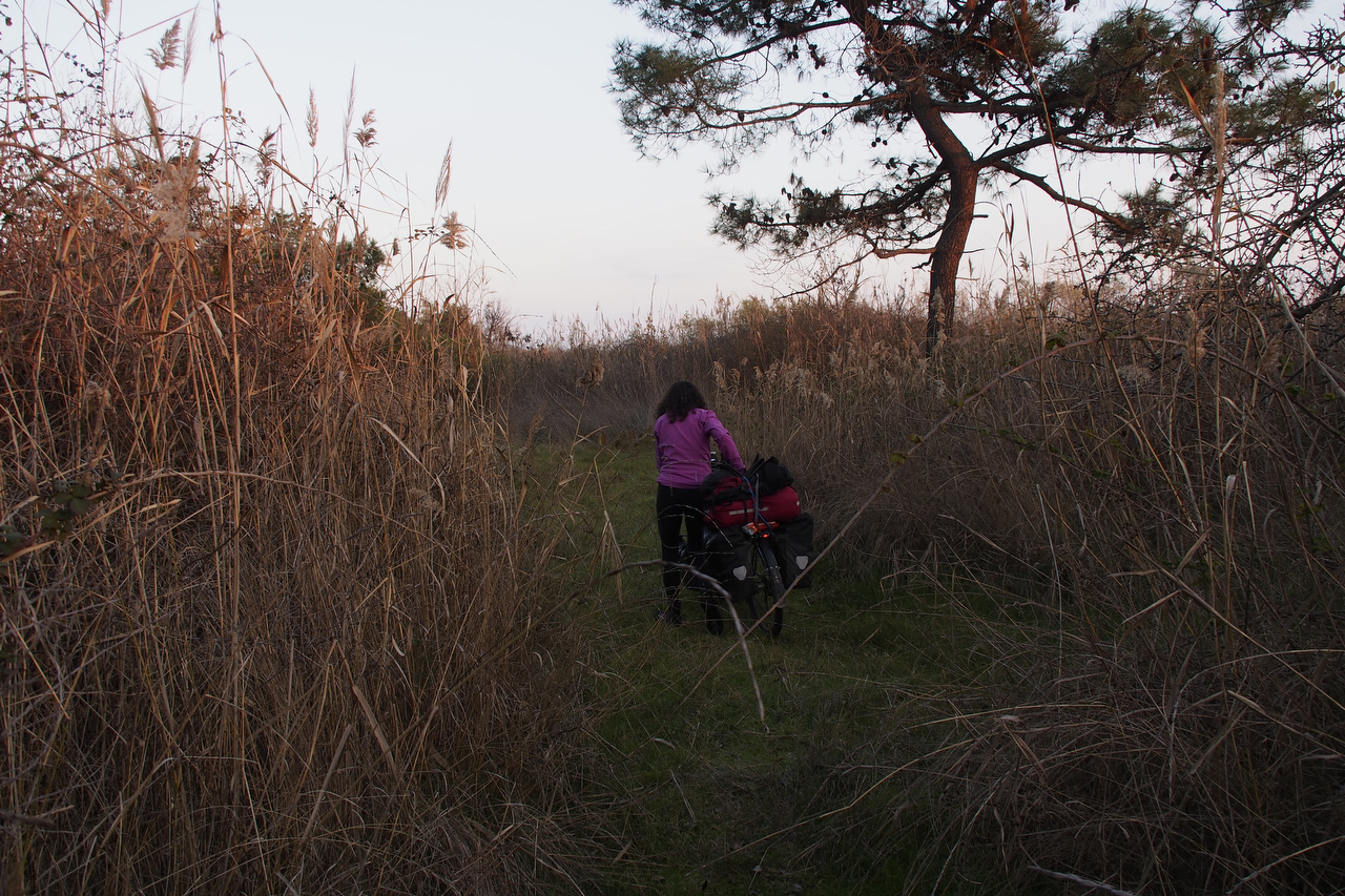 We stocked up on drinking water in town, bought some snacks to add to our food stock and rode back to the forested area on the edge of town. We found a nice spot on the edge of the forest on the beach just as the sun was slipping toward the horizon. It was a gorgeous evening.