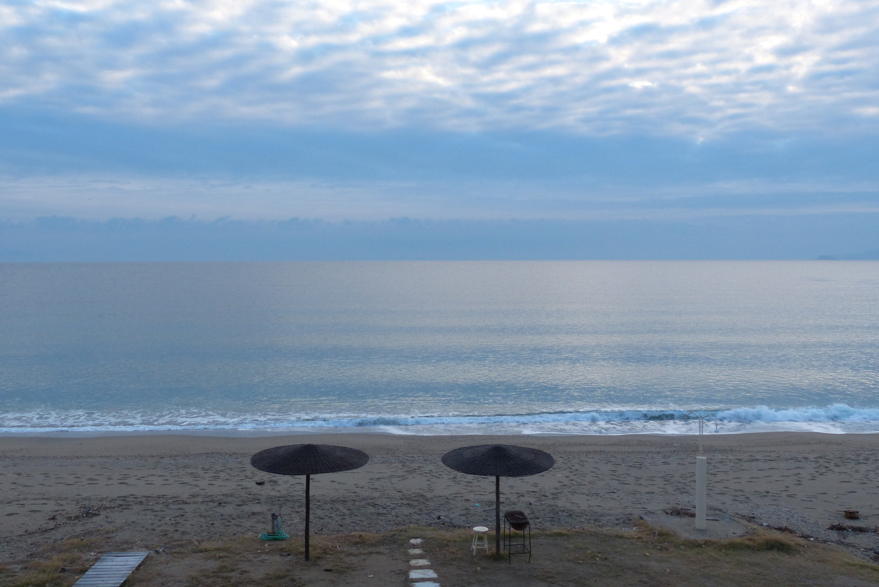 We left on a brilliant, sunny morning cycling north through the mountains towards a secondary highway along the south shore of Volvi Lake. We got as far as Vrasna Beach on the western shore of the Aegean Sea. As in most places, these resort towns are pretty much shut down in winter. We were eyeing some of the unfinished houses in town as possible camping spots but Le Chocolat Hotel was still open and we got a room with a lovely view of the beach across the street.