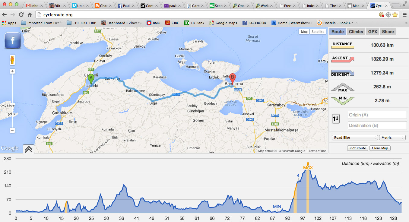 The other useful tool with the GPS is another web site: http://cycleroute.org/ where you can enter your starting point and end point and it will display a map of a route, along with details of distance, ascent, descent and minimum and maximum elevations, as well as a graph showing elevation changes. It’s a helpful tool in planning your day.