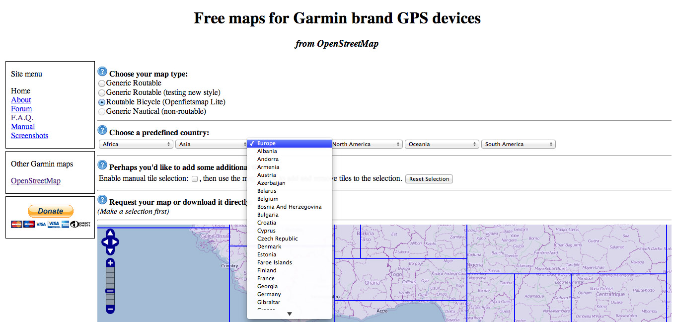 If you want only a map of part of a country you can make a custom map by clicking the box beside “Enable manual tile selection.” Then you can click through the tiles on the map to select your desired tiles. Once you have finished your selection, the system will ask you to enter an email address so you can be notified when your map is ready for downloading. This sometimes takes only minutes but if there are many requests it can take longer. Once you get the email, click on the link which takes you to the download page where you can download the ‘gmappsupp.img’ file for the Garmin and the ‘.gmap’ file for Basecamp. The files can be large so you need a stable internet connection and some time.