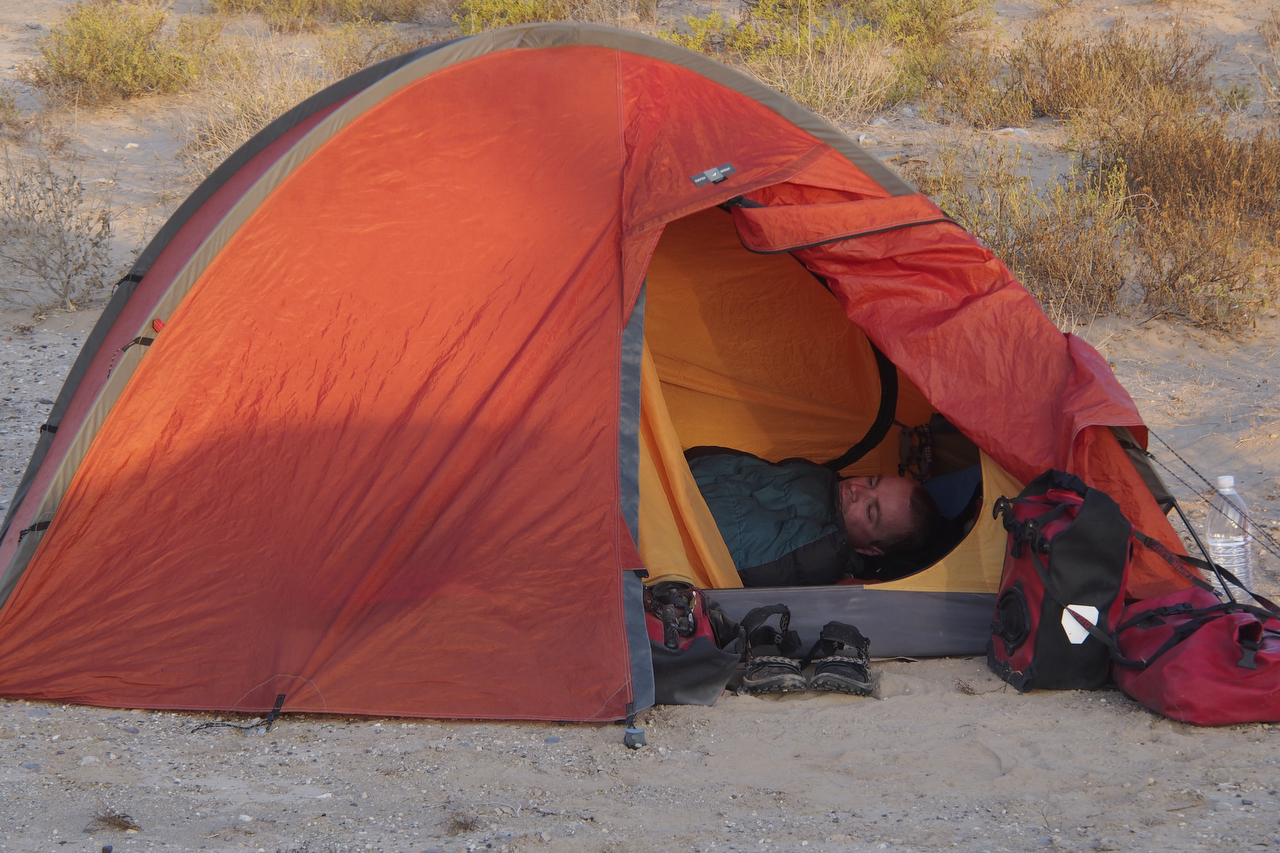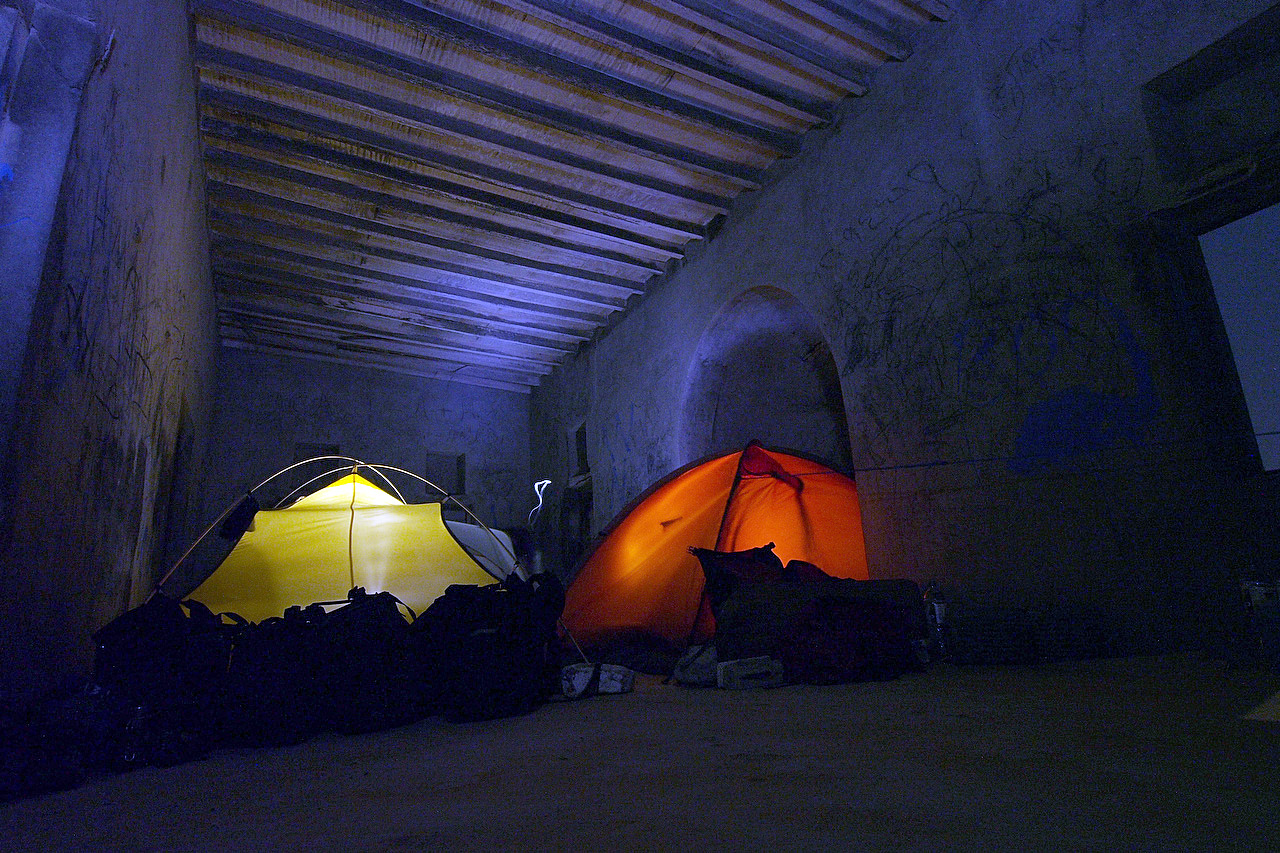 There was not much shelter to be found except a small abandoned building near where some fishing boats were sitting on the beach. Being familiar with camping in abandoned buildings, this was a natural location for us to pitch the tents. The building turned out to be an old mosque, long since abandoned and falling apart. Graffiti covered the inside walls and the windows had long ago been knocked out, but it was a good place for us to spend a night in our Little Mosque on the Beach.