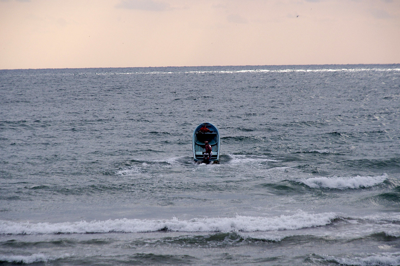 In the morning, the wind had let up a little but was still blasting from the north. We were treated to a gorgeous sunrise and watched a fisherman get his boat ready and into the water to earn his living.