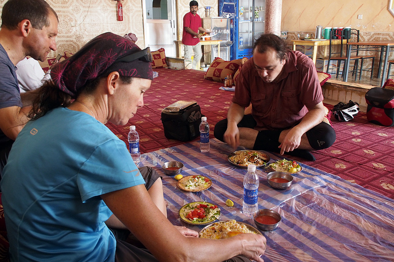 We mostly camp just off the road and out of sight after stocking up on food and water in a nearby village. Food in restaurants is quite cheap and the portions very generous so we have tended to eat either lunch or dinner in restaurants. The five of us can eat a big lunch or dinner with meat, rice, salad and delicious mango juice for about 10 OMR ($30).