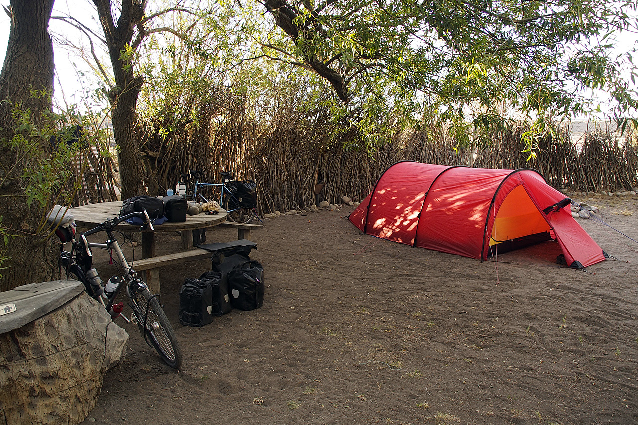 We bought a couple of beers – one has to hydrate – and made camp behind a wind break built from twigs and branches. Hot showers washed away the sweat and pain from 109 kilometres on the road. Dinner was spinach and ricotta ravioli with pesto, followed by tea and chocolate. In the mean time, the sun had set and we headed off to bed. It was not even 9 p.m.
