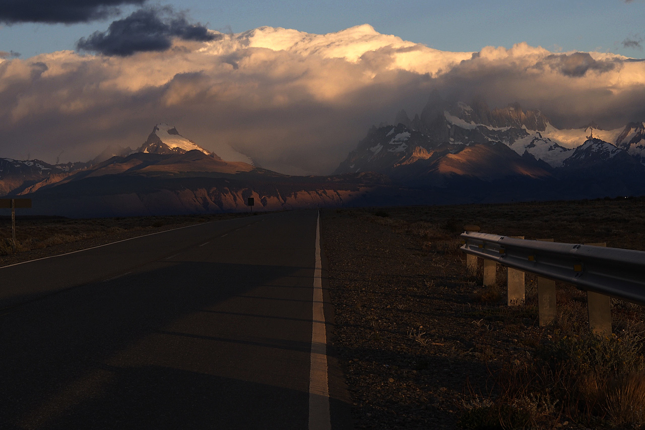 We rose before day break, hoping to get on the road before the wind built up. The sunrise was spectacular: a fire red and orange horizon with indigo clouds above. The first 25 kilometres were good as we headed northeast on Ruta 40, but as soon as we turned west onto Ruta 23 we were riding straight into the westerly wind. The sign read 95 kilometres to El Chaltén.