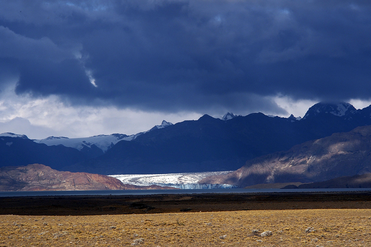 Distant views of Cerro Torre and Fitzroy slowly inched closer all day while turquoise Lago Viedma lay on our left and a low mountain range to our right with golden pampa in between. And because of the wind, we got to enjoy that view all day long.