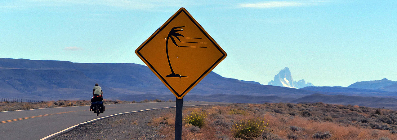 Cycling into the wind with Cerro Torre on the horizon.