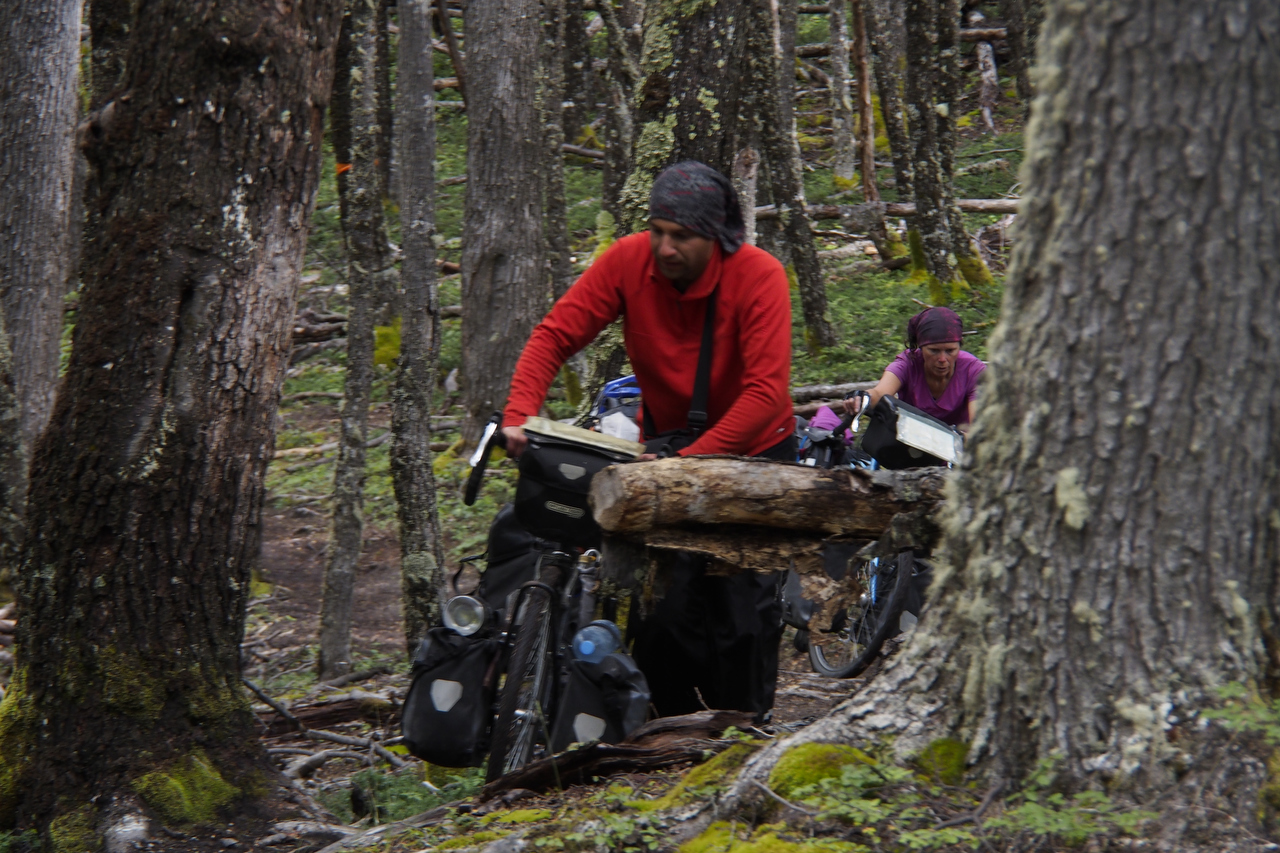 The trail improved somewhat as we climbed higher into the pass and we were even able to ride short sections of it but there were many obstacles in our way that required the two-person push or lift-over again and again. Eventually, after six hours of carrying, pushing, dragging and lifting our bicycles and panniers up six kilometres of rough trail we gained the pass.