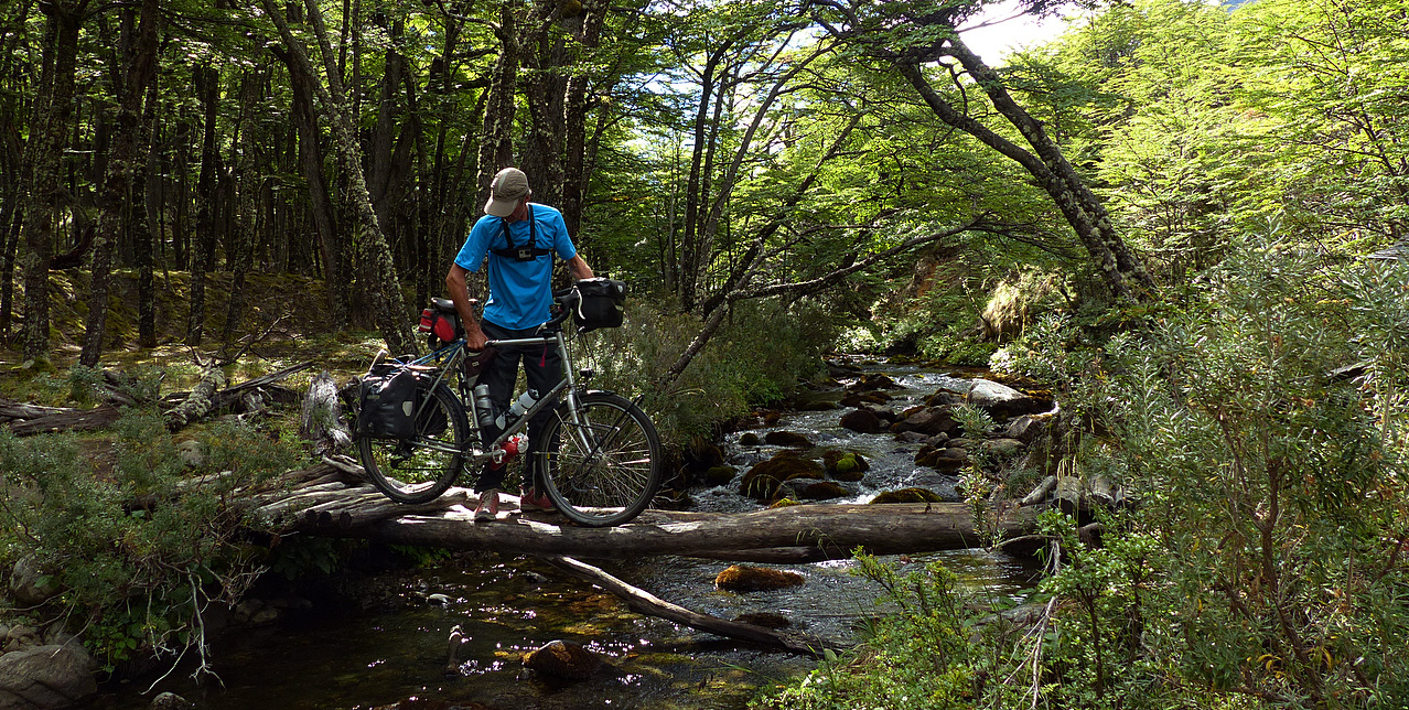 Progress was very slow but at least the weather had improved from grey and gloomy to warm and sunny. Creek crossings added another challenge with rickety log bridges balanced on rocks and other logs. Getting the bicycles across was an adventure in itself.