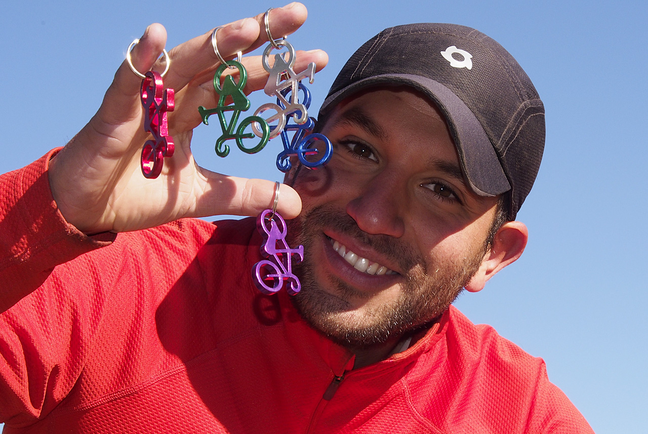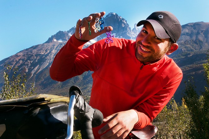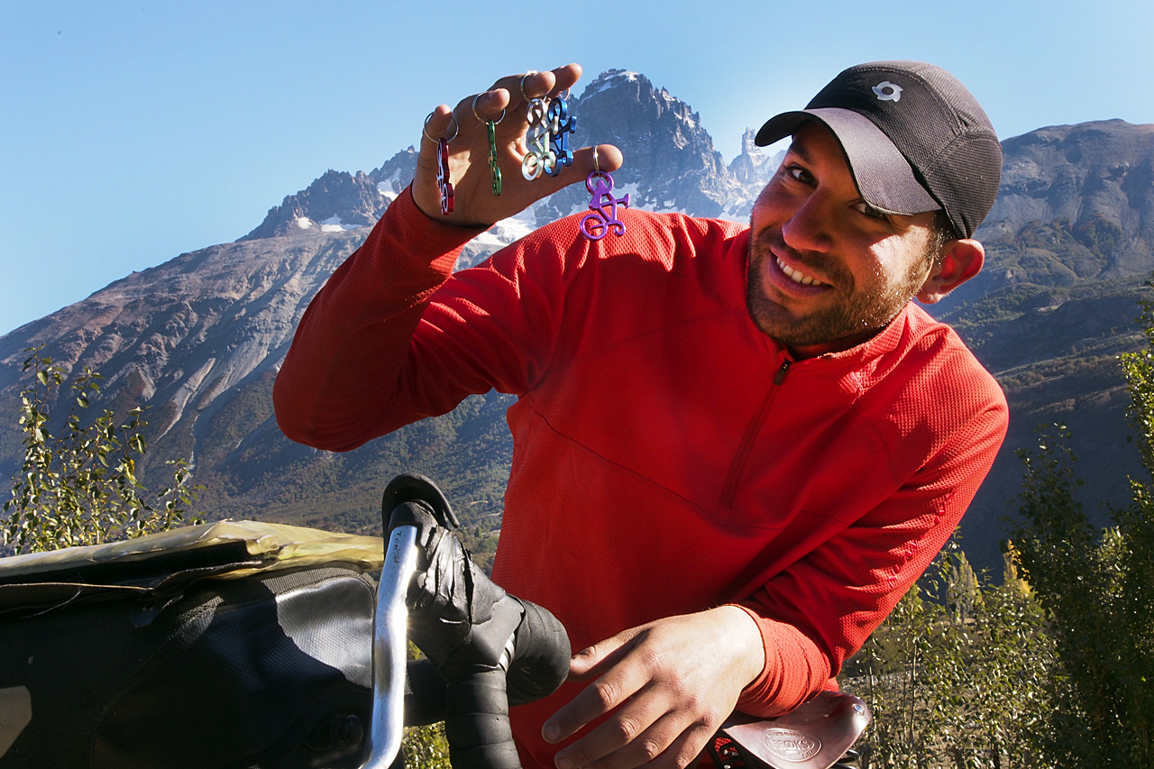 To earn money, Brian is selling bicycle key chains in the larger towns. Instead of a set price, he asks people for a donation to help him realize his dream or cycling around South America and in exchange he gives them one of the key chains.