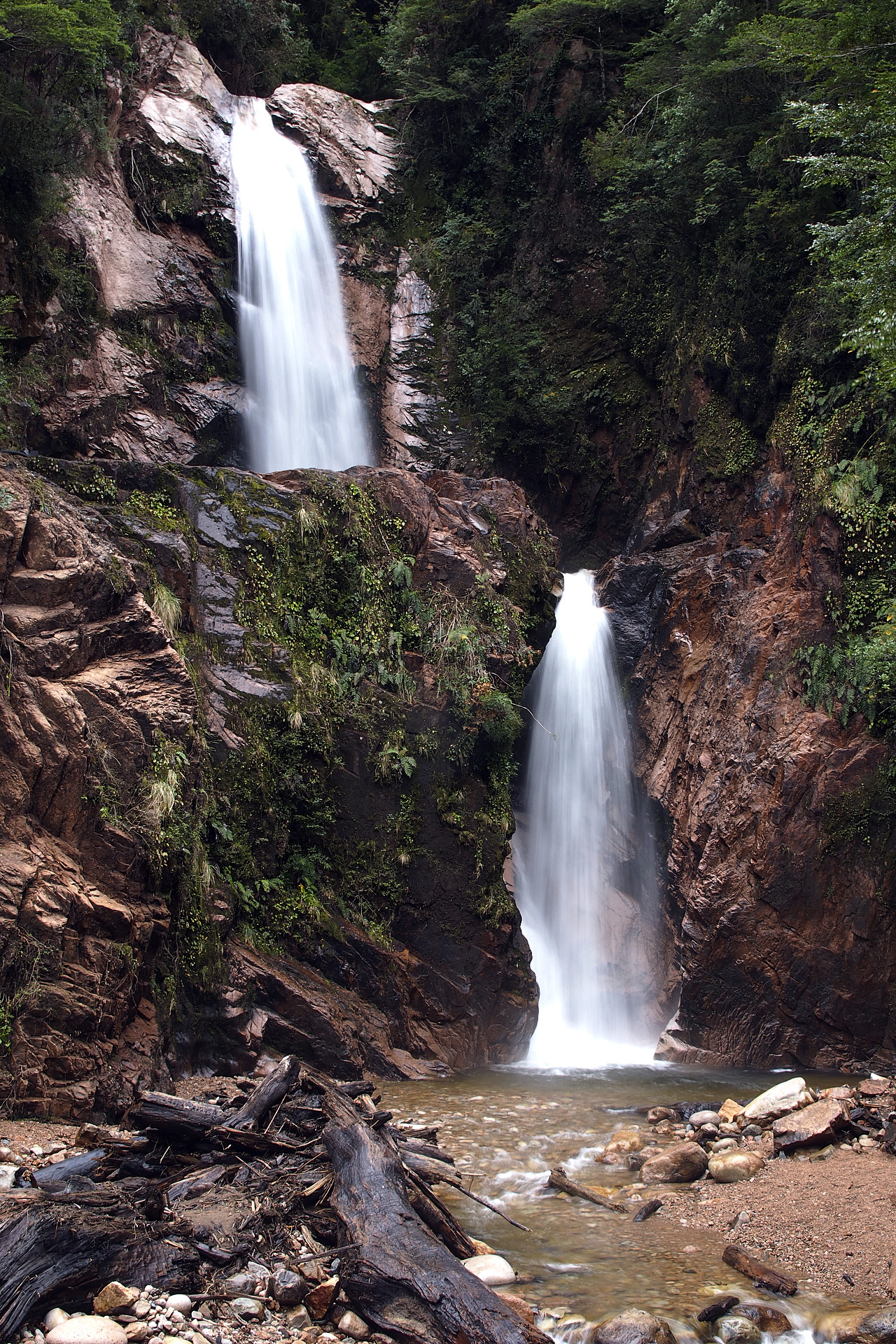 We got back on the bikes and rode on, stopping only to pick up water at a creek away from town so that at least we could camp at the next suitable spot. The climb out of Villa Amengual was a steep three kilometres with no places to camp anywhere. Once on top, we gazed down into the valley of Rio Cisnes with its large gravel bars offering plenty of camping. The ride down was very fast through several hairpins and we found a great riverside spot to camp just as the sun was setting.