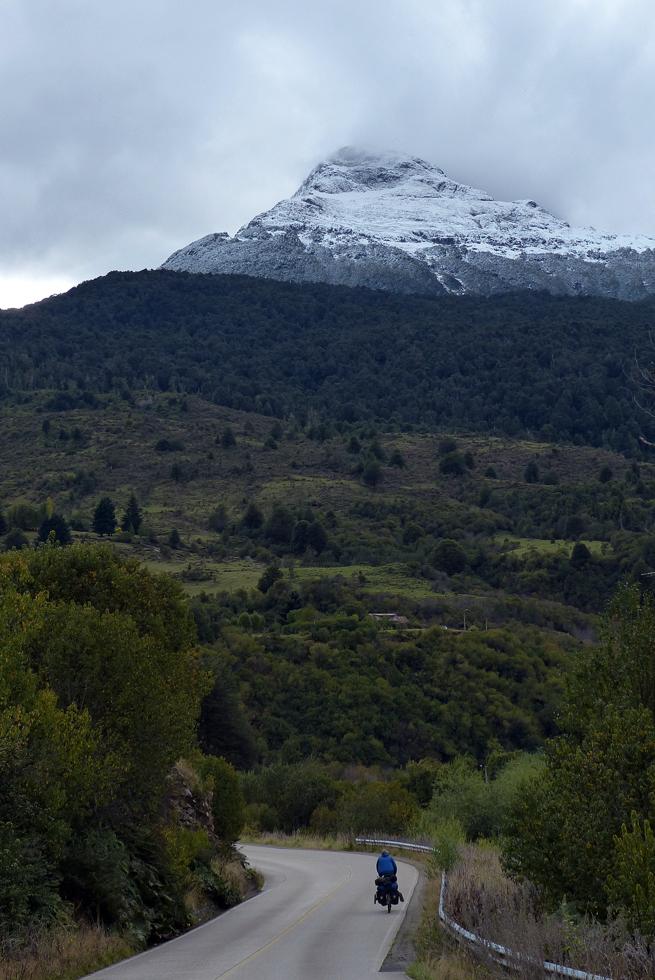 The landscape around Coyhaique continued to be grass lands, similar to the country north of Lago General Carrera. But that changed as we descended the ridge and plunged into the narrow valley of Rio Simpson. The sun did not reach the road which meant it was quite cold. But we were on a downhill trend and we were able to stay warm by setting a fast tempo along this twisty track.