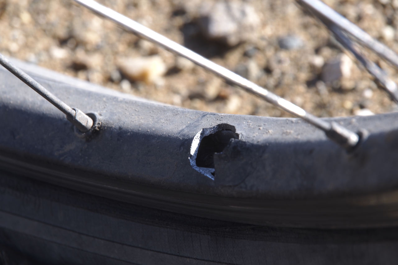 I hammered the brakes and got off the bike to check and saw the dangling spoke. Of course it was on the cassette side. Meaning: the wheel has to be taken apart so the spoke can be replaced. What was odd about it was that the spoke seemed intact and the nipple was still attached. As I gently rolled the bike forward it became obvious why. Where the spoke had been threaded through the rim was now a gaping hole.