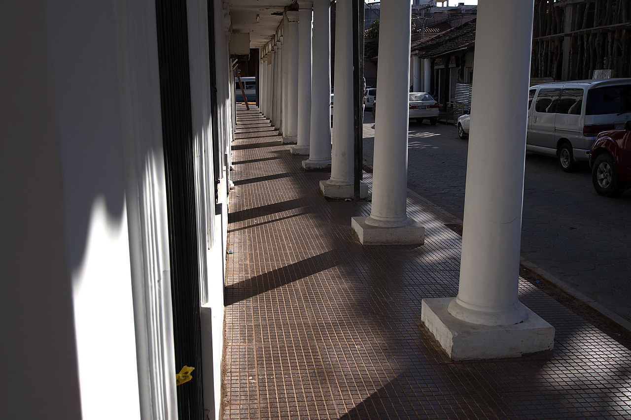 Light and shadow in an arcade along Avenida 24 de Septembre.