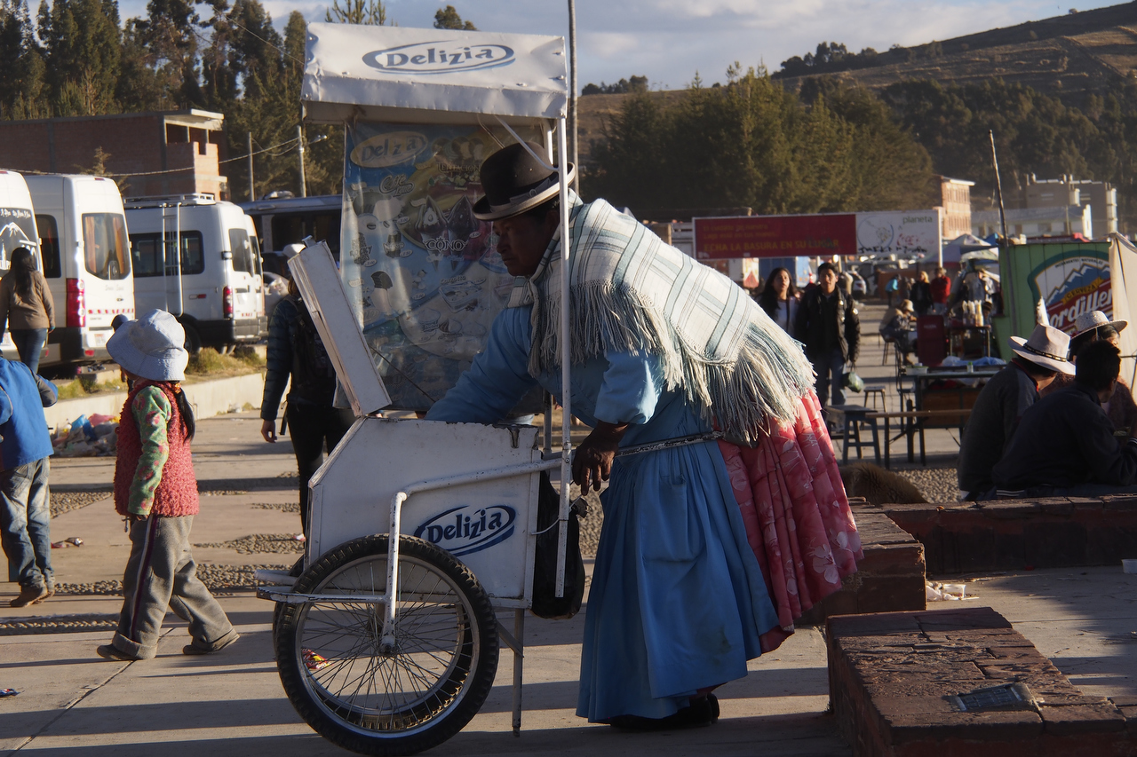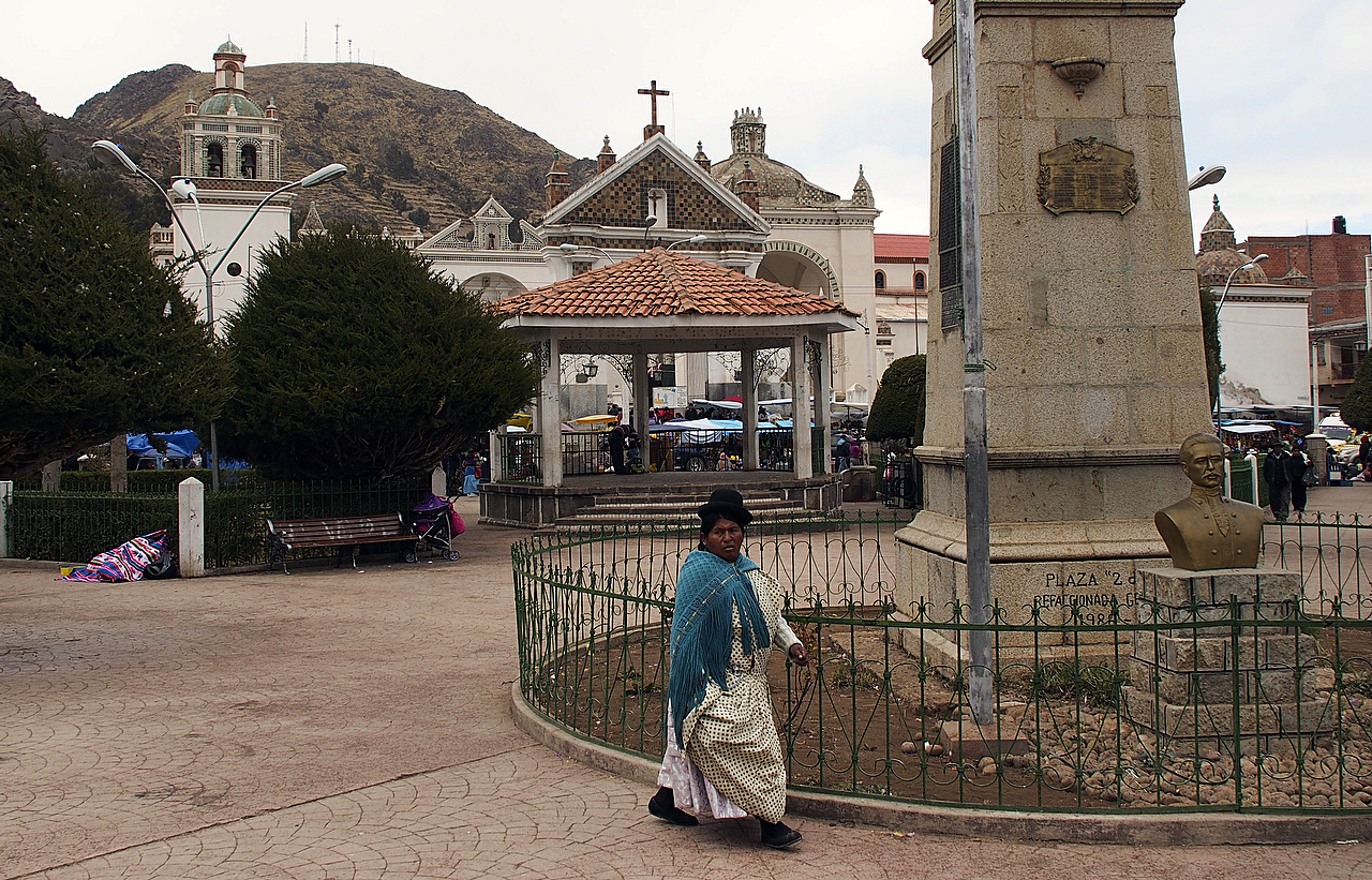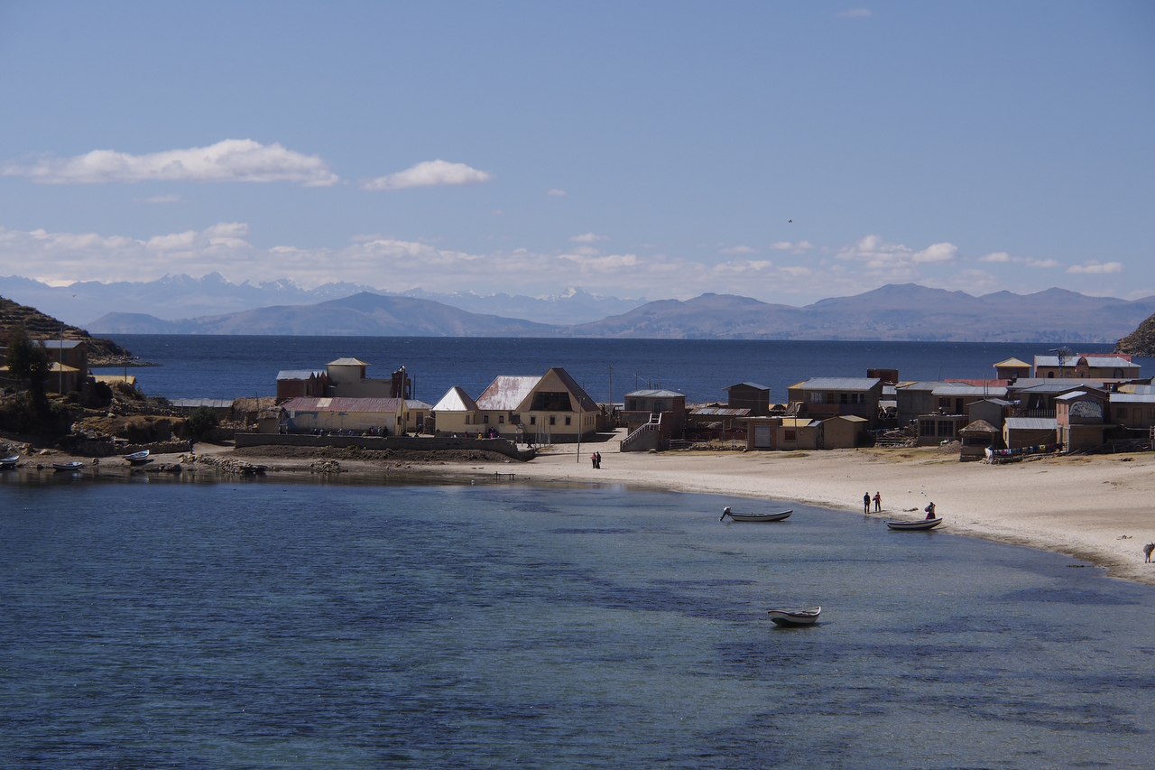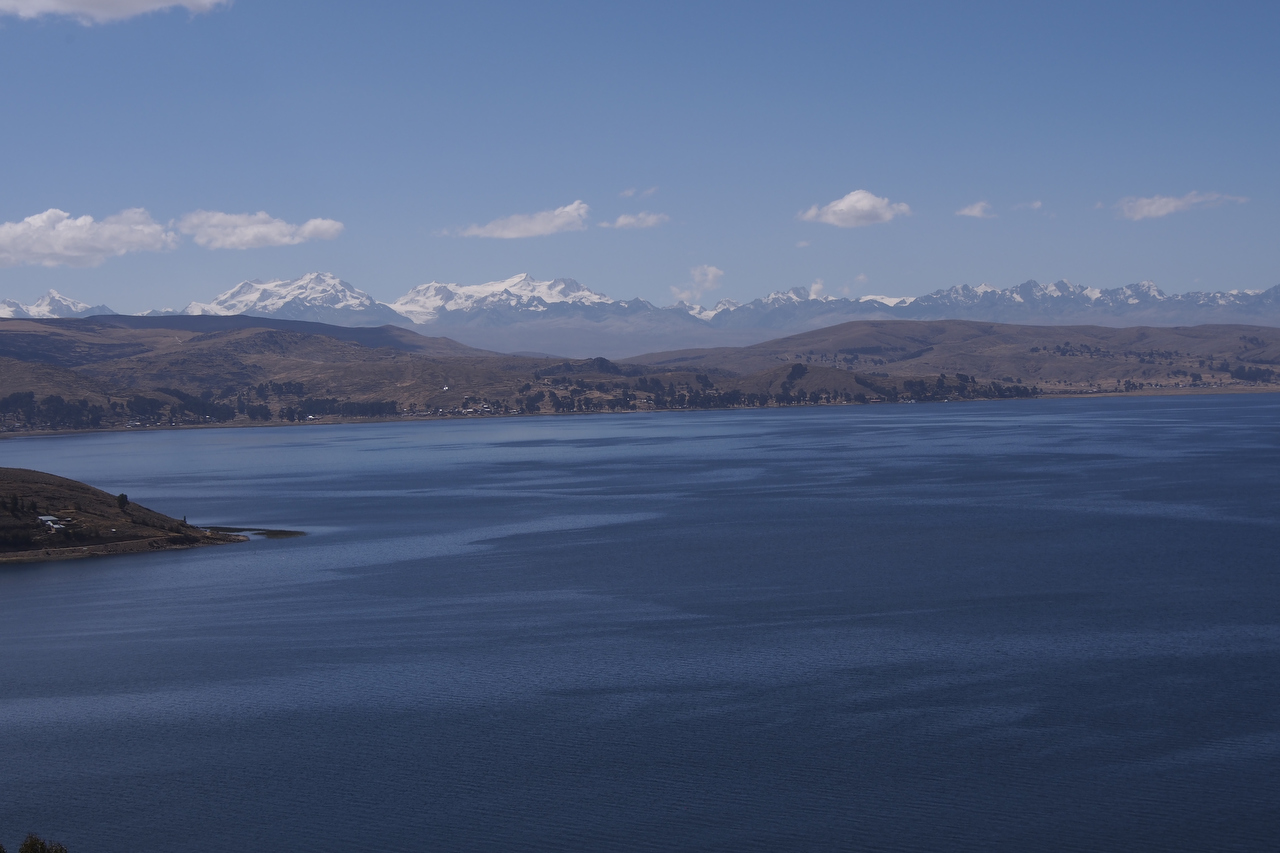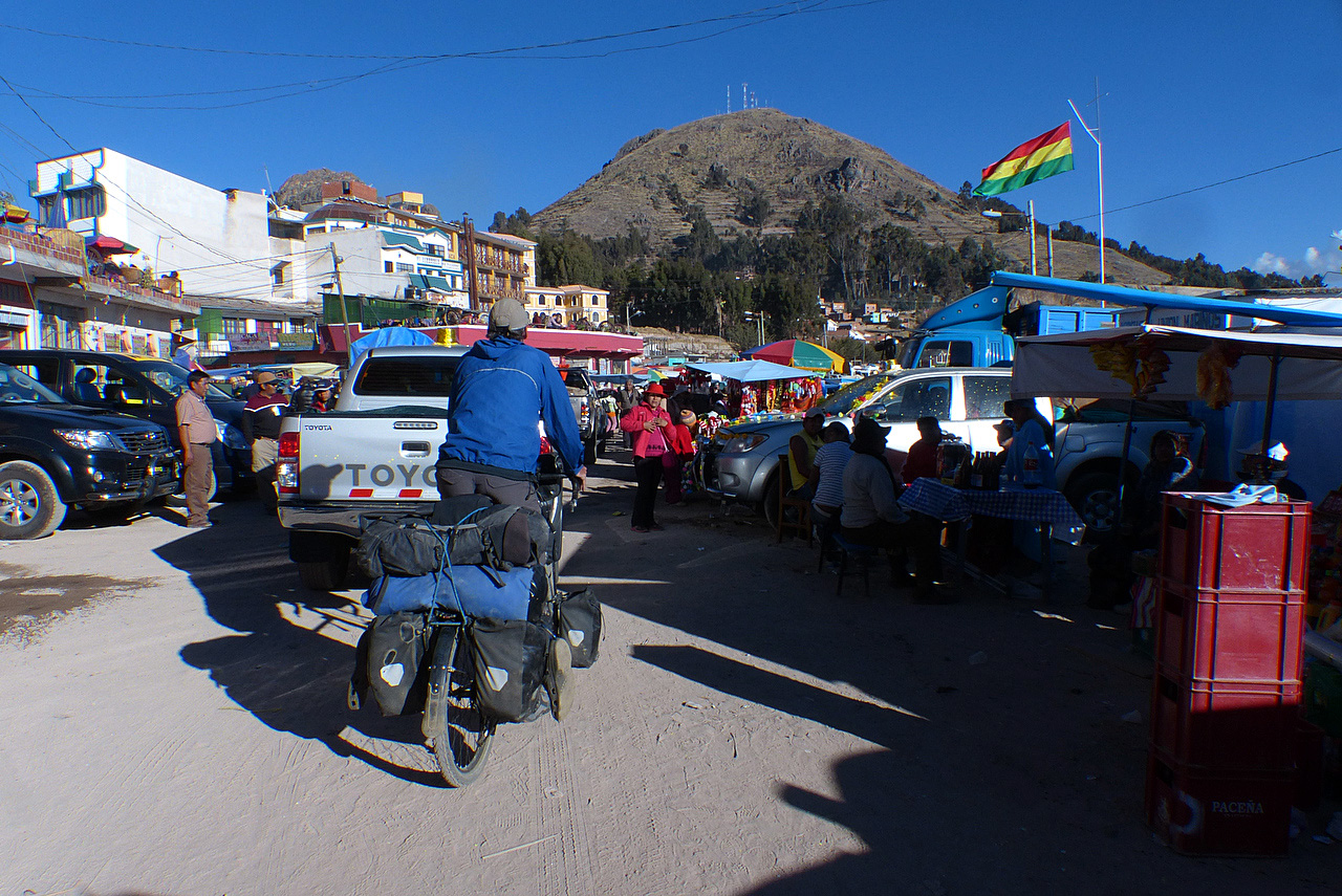 It was good to leave the frantic environs of El Alto. It took us a couple of hours to cycle out of the city. Our progress was hampered by a couple of large Independence Day parades creating gridlock. We eventually found a side road parallel to the highway which got us out of the chaos. By mid afternoon, Lake Titicaca came into view as we cycled along a fairly quiet road on our way to Copacabana.