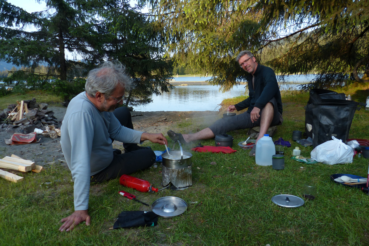 We ended our day’s ride in Sooke at a very expensive campsite where they charged us $25 per tent. On top of that, the showers also required money so we chose to forego those. Nevertheless, we had supplied ourselves in town with a bag of charcoal, four big steaks, potatoes, veggies, beer and wine. A fitting meal for four hungry cyclists.
