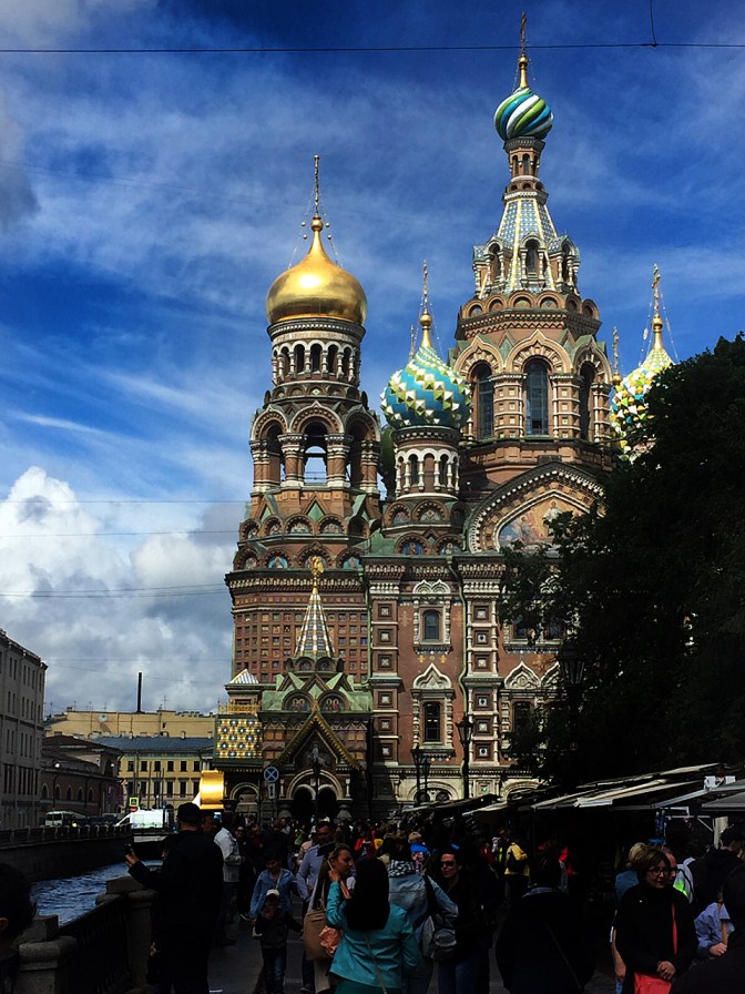It’s June 21. Solstice. On board the ferry, we stay up to watch the sun set over the Baltic Sea at 11 pm. More sleep. Or an attempt at sleep. The droning in the back of my skull finally drives me out of the small, stuffy cabin at 6 a.m. as we sail into the outer harbour of St. Petersburg, Russia. For two hours we sail through an industrial landscape until we dock not far from the centre of the city.