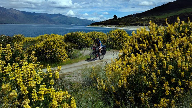 We mostly ride Highway 6 all the way to Hokitika, with the exception of the Upper Clutha River cycle trail from Wanaka to Lake Hawea, where we are forced back onto the highway. We pull off early as a nice lupin-studded camp site beckons on the lake shore.