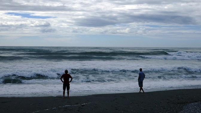 Highway 6 threads its way through the mountains over Haast Pass. It takes us two days to ride through the mountains to the coast. We spend a night at Fox Glacier but hurry through Franz Josef Glacier as we can’t stand the noise of helicopters and tour buses. There is a lot of motorized recreation going on. Not our kind of thing. Instead, we go to Okarito, despite the 12 km out-and-back to the coast. It’s a tiny town on the shore of New Zealand’s biggest untouched wetland, famous for its bird life, particularly the extremely rare eastern great egret. Okarito Lagoon is the only place it breeds. We don’t see any egrets. There isn’t much in Okarito except an ice cream stand that has just run out of ice cream when we show up. The guy is very apologetic but offers to make us some berry smoothies instead. We accept.
