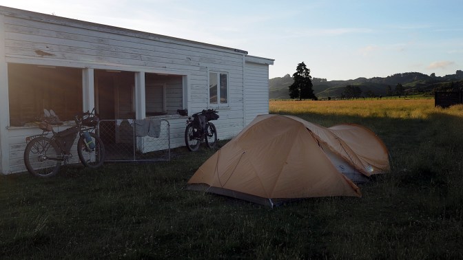 It’s a long, dusty, hard ride and by the time we arrive in Apiti, we are spent. Thirsty, hungry and cranky we find the pub in this one-horse town closed a half hour ago and there is no store. Dejected, we follow the directions on the phone to the Apiti Reserve and find a couple of buildings in the middle of a field. Initially, our hearts sink but never judge a book by its cover. There is cold running water. There are rudimentary but clean bathrooms, complete with soap and paper towel, and the adjacent room provides shade from the still sweltering sun as well as chairs to sit on. We make camp, wash up and have cappuccinos with cookies, and before long we feel better. It’s home for the night and beats any of the $40 holiday parks hands down.