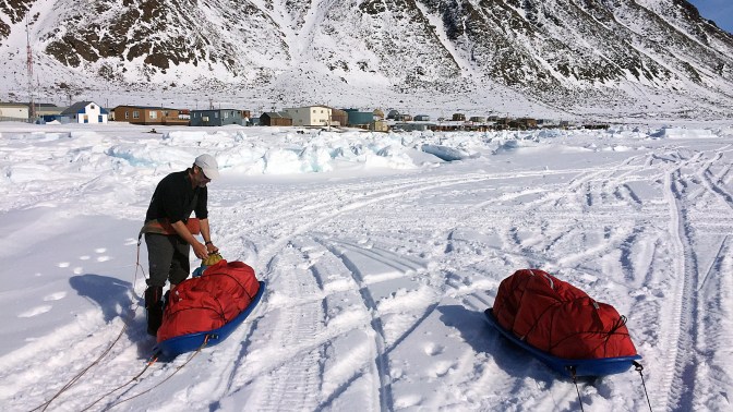 The sleds are heavy as we ski away from town. I’m hauling my body weight in a sled, about 80 kilos, but it’s surprisingly easy to haul, as long as we’re travelling horizontally on sea ice. As soon as we hit an incline, gravity takes its toll and it becomes back-breaking work. If a hill is too long or steep, we have to double up one sled to get it up the grade, and return to do it again for the the other sled.