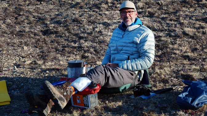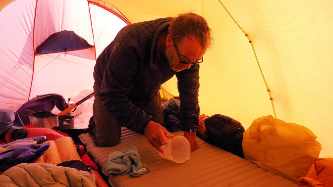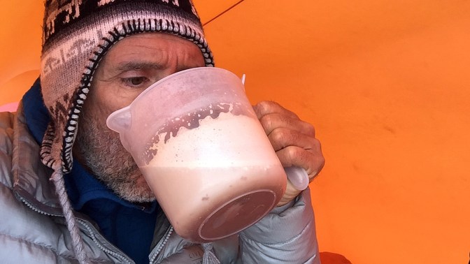 We bask in the sun as we make a dinner of pasta with pesto sauce and add our secret ingredient: peanut butter. It’s tasty and packs a great calorie punch. I always loose weight on these trips and it is my goal to minimize that on this journey. We have the same breakfast every morning: 200 grams of granola with whole milk powder and hot water, and a cup of coffee. We graze on various kinds of bars, nuts and chips throughout the day, and we usually stop at some point during our day to make a cup of tea.