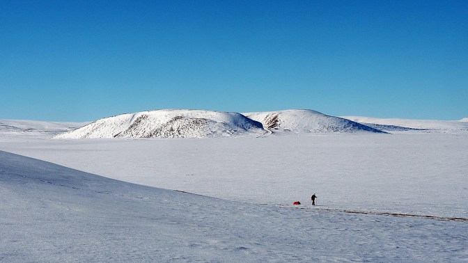 Three days later, we have skied 48 km further north and climbed up about 300 metres from sea level to a pass through the mountains to the south end of the Braskeruds Plain. We haven’t seen any wildlife, although we’ve come across tracks from arctic foxes and musk oxen.