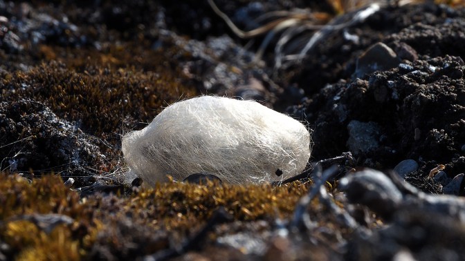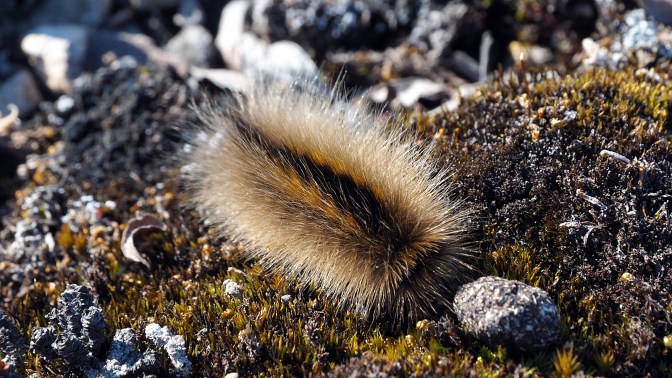 We pull up beside a circular spot of tundra that is free of snow. It’s too lumpy to camp on so we stomp out our 2 by 4-metre tent platform in the snow beside it. But among the tiny willows we spot one of the Arctic’s most remarkable residents: the Arctic woolly bear caterpillar. This hairy caterpillar is best know for its slow rate of development and long periods of hibernation in extended periods of extremely low temperatures. It can take up to 15 years for the caterpillar to become a moth. The caterpillar feeds primarily on Arctic willow but will eat other plants like purple saxifrage and mountain aven.