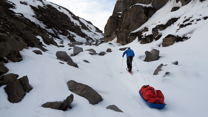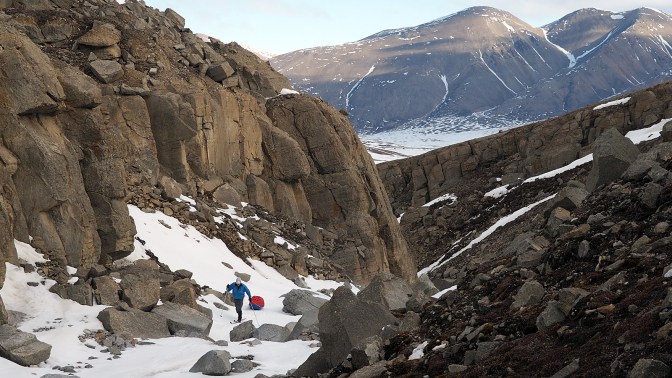 The next day, my leg looks and feels better and we continue. John hauls both sleds until we hit a canyon we have to ascend. We team up through the technical ascent and eventually gain the height of land. It’s completely snow-covered. There is no sign of spring.