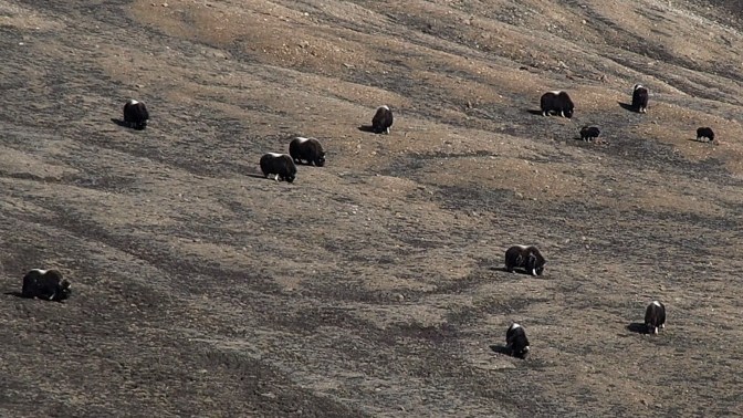 The view is magnificent and for only the second time we are camped on dry land instead of snow. To the north, on the other side of the canyon, a herd of musk oxen blissfully grazes in a steep meadow. Eleven adults and three new calves slowly make their way down the slope. While the adults graze, the calves chase each other around the meadow. We sit and watch them until they’re out of sight below us. A while later they appear again to the south.