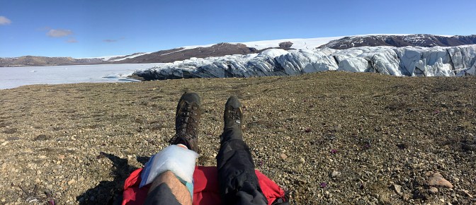We were not the only ones to use this route to Makinson Inlet. We followed tracks of a small herd of musk oxen all the way up. In the distance, we can now see the Split Lake Glacier and the ice field beyond. It’s brilliantly sunny but a cold wind blows down the valley and we resort to skulking in the tent where it’s warm as the sun mercilessly reflects off the snow. My leg still hurst and the swelling has increased from the day’s work. All I can do is apply ice, elevate, rest and hope it gets better.