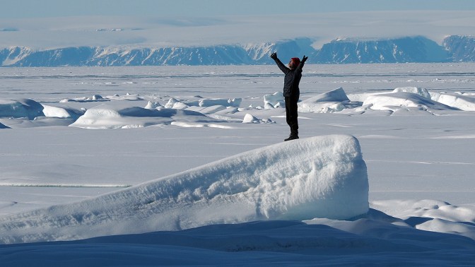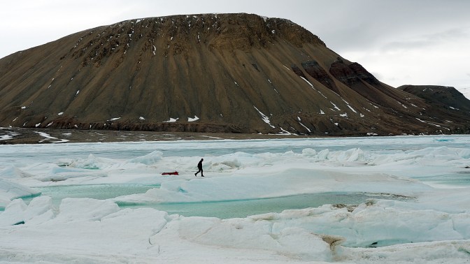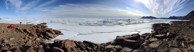 We eventually pack up and head out. Ice conditions are pretty good but there is still a lot of water on the ice, especially in the mouth of Starnes Fiord. Wet feet again. Oh well. We follow a lead in the ice, looking for a place where it’s narrow enough to cross but a polar bear stops us in our tracks. He’s a few hundred metres ahead and we wait, giving him time to move on. We lose sight of him in the pack ice ahead.
