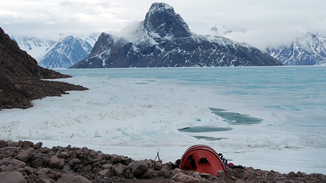 The storm abated overnight but it’s a cold nasty day. We break camp and hike down to where we cached the sleds with the rest of our food and gear. We walk out of Split Lake on to Makinson Inlet. Most of the sea ice is flooded now but closer to shore on the low tide there is enough dry ice for us to haul the sleds without getting our feet wet. We make good progress and make camp 21 km down the inlet at Hook Point. The two lobes of the Hook Glacier surround this point of land that will perhaps eventually become an island when the glacier retreats more.