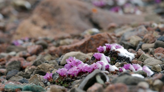 When we get to Bowman Island, we decide to call it a day after only eight kilometres but the conditions are too horrendous to carry on. We dig out a tent platform in a snow bank between the rocks with the top of Bowman Island towering 500 metres above us and make camp. We dive into the tent and fire up the stove to make a hot drink and dinner. The stove heats the tent quickly and we take off wet boots and socks. It’s the best feeling but it takes a few hours for my numb feet to warm up. Outside, it’s blowing and snowing, slowly covering the blooming purple saxifrage.