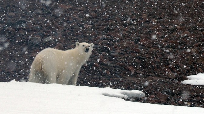 I got a few blurry photos and a couple of decent frames. It’s a younger bear, not the one we had seen earlier on the other side of the fiord. It’s still snowing but since we are very much awake now we make coffee and breakfast, followed by a second cup of coffee.