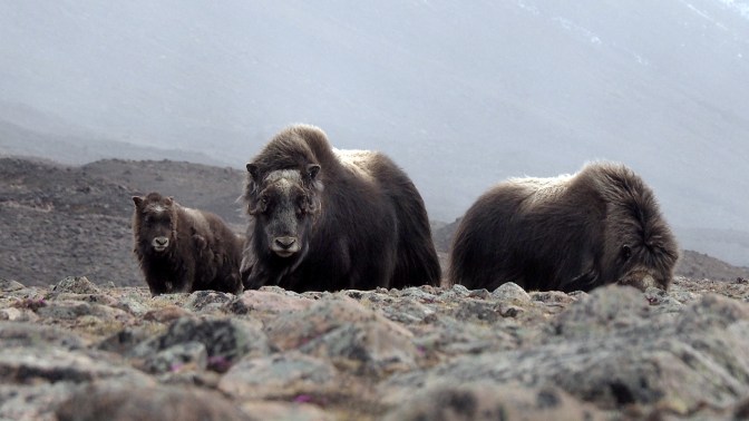 We are sitting outside for once enjoying a cup of tea after the day’s work and spot some musk oxen on the other side of the valley. We watch them cross the river as they continue to wander towards us. They haven’t seen us yet, so we stay seated and watch them through binoculars coming closer. We are in a little hollow and lose sight of them momentarily when, suddenly, they appear on a little rise about 50 metres away and they spot us. They don’t seem to be bothered by our presence and continue to graze. There are three cows and three calves.